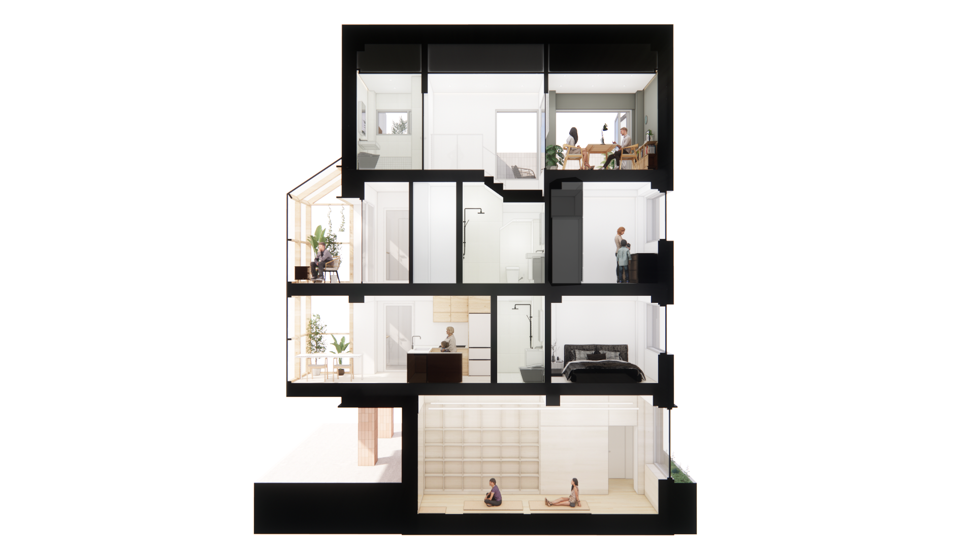 도시에서 나고 자란 우리세대들은 도시를 벗어나서 살기가 쉽지 않다. 문화, 교육, 직장, 의료 등의 문제로 도시에 거주해야만 하는 상황도 무시할 수 없다. 도시내에서는 단독주택지가 적어서 보통 다가구, 다세대주택으로 계획되는 경우가 많다. 이런 공동주택에서의 전기집을 계획하였다. 표준주택은 1층 상가, 2층 임대주택, 3,4층 복층주택으로 평면을 구성하였다. 장기간의 친환경건축을 위해 기둥구조를 선택해서 자연스럽게 층간소음이 완화되고 칸막이벽의 변경이 쉽게 되었다. 전기집의 적용은 세대별로 옵션으로 적용가능하다.